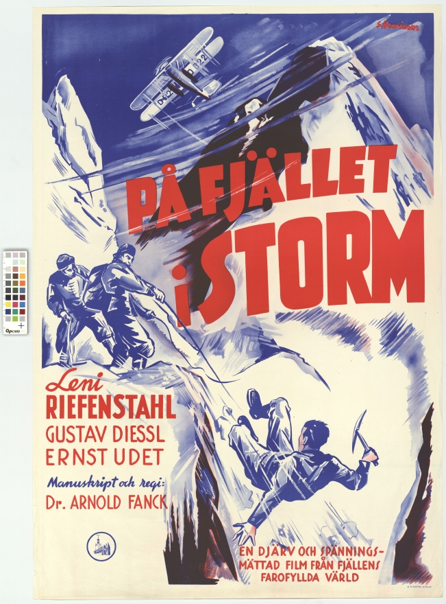 1927 kom ”Der grosse Sprung” eller ”det stora språnget” av en skäligen usel regissör vid namn Arnold Fanck, med Leni Riefenstahl i den kvinnliga huvudrollen, såklart. Man påstod att det skedde allehanda knull mellan regissör och kvinnlig huvudrollsinnehaverska också, men så var det nog inte… däremot gjorde Leni Riefenstahl helt autentiska klätter-scener i Dolomiterna – ibland kompletterat med inklippta studio-tagningar under den här tiden.. Arnold Fanck var förstås ledande inom ”bergsfilm” och utomhus filmande i snö..