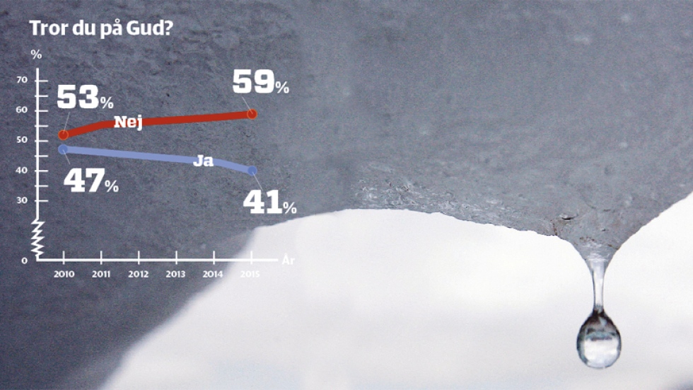 Bara 41 % svarade att de ”tror på gud” år 2015, jämfört med 47 % år 2010, och med den takten har vi sluppit alla kristna, muslimer och övriga monoteister om 35 år. Endast 25 % av svenskarna har överhuvudtaget besökt en kristen gudstjänst de senaste tolv månaderna, emot 35 % för fem år sen. Och 59 % tar skarpt avstånd ifrån varje tanke på den kristne ”guden”, och svarar ett klart ”Nej!” på frågan om dennes existens, jämfört med 53 % ”Nej !” år 2010.