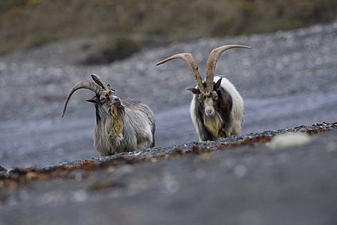 Feral Goat (Capra hircus) two goats eating seaweed on carsaig beach on Mull. Argyll and the Islands, Scotland, UK