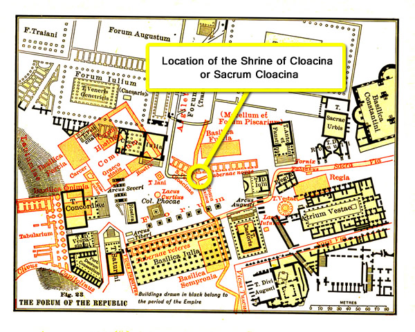 För att återgå till Cloacina, så har spår av hennes Helgedom hittats på Forum Romanum, i hjärtat av det Romerska imperiet, ja dess absoluta nav från äldsta tider… Hon skulle vara intimt sammankopplad med Cloaca Maxima, den största av Roms alla kloaker, som byggdes redan på 600-talet före kristus av en etruskisk kung, och som byggts ut och byggts ut sen dess, och fortfarande används, även om fontänen och fot-tvagningsplatsen på Forum är torrlagd nu..