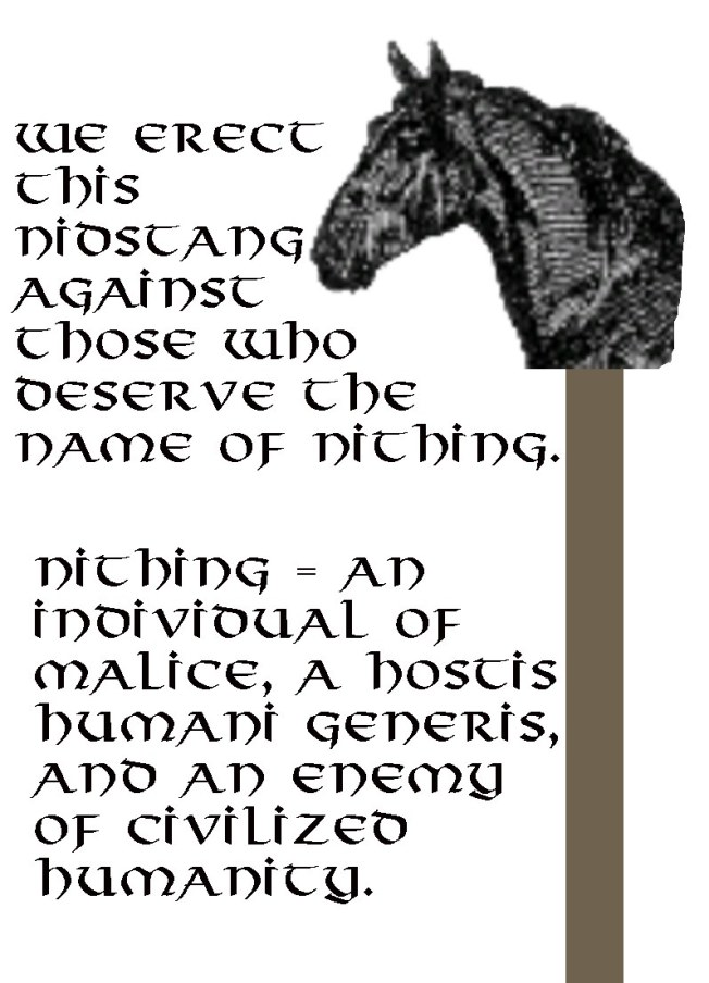 Carita Holm resonerar också kring det juridiska begreppet ”Nid” – oavsett om vi talar om Tungonid, Tränid eller Nidstänger – företeelser som var förbjudna åtminstone i de isländska och norska lagsamlingarna, och vad tungonidet angår var straffbelagt också i svenska lagar, som den Äldre Västgötalagen.