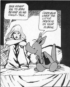 Kolla in serie-rutan ovan ! Ni ser själva hur Cerebus står som fallen från skyarna, inför vad som är ett ohöljt frieri… Cerebus reagerar genom att låta ”Sonja” (eller Sophia) bära all hans packning – på 45 kilo rå potatis och gammal spill-säd (en Aardvak eller ett svin kan leva på nästan vad som helst)  till närmaste by, och svarar med att ”jaha sötnos, du SA att jag fick utnyttja din kropp som jag ville…och det ska jag ta mig fasiken GÖRA också…”