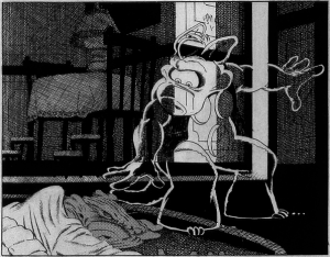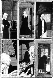 En styrka som jag tycker att ”Cerebus” har är detta med inre monologer – och personskildringar – något som ofta återkommer – liksom att berättelsen är starkt filmisk – med bara sex rutor på en sida – och mycket tusch – lyckas Sim och ”gerhard” – hans medhjälpare – förmedla illusionen, att vi faktiskt ser ett händelseförlopp, som i alla fall påminner om det som är verkligt… Låt vara att det finns mycket tankeflykt, samt utflykter i det blå – eller ”fylle-skildringar” också – de senare är rätt så härliga..