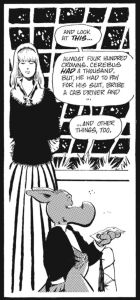 Cerebus och ”Red Sophia” – två av Sims många figurer – tecknade av ”Gerhard”, Sims flitigaste medarbetare, som annars bara fick designa bakgrunder och interiörer, något han blev erkänt skicklig på…