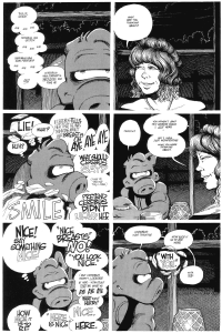 De sista avsnitten av 300 – där Cerebus, gammal, ensam, oälskad och sjuk – han lider av allt från hemorrojder till skör benstomme och ryggskott – slutligen snubblar, dör och har en utomkroppslig upplevelse, är faktiskt något av det mest rörande jag läst – på allvar…Skildringen av ålderdomen och förfallet är inte alls ”komisk”. Den är djupt tragisk, och även avsedd att vara det…