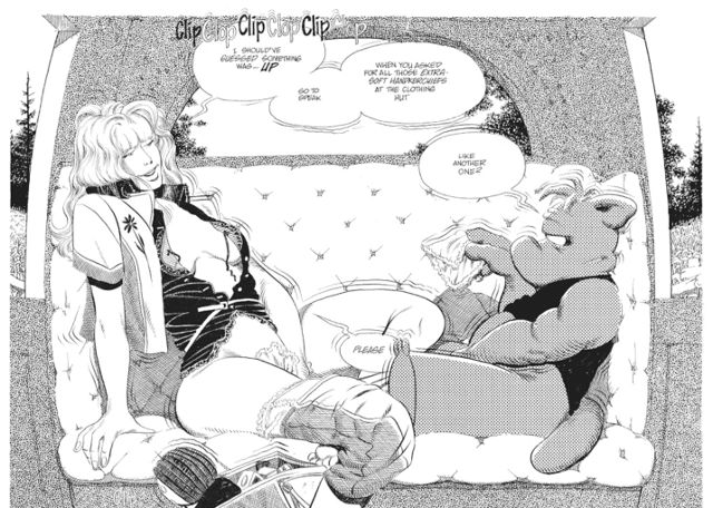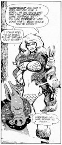 Kolla in serie-rutan ovan ! Ni ser själva hur Cerebus står som fallen från skyarna, inför vad som är ett ohöljt frieri… Cerebus reagerar genom att låta ”Sonja” (eller Sophia) bära all hans packning – på 45 kilo rå potatis och gammal spill-säd (en Aardvak eller ett svin kan leva på nästan vad som helst)  till närmaste by, och svarar med att ”jaha sötnos, du SA att jag fick utnyttja din kropp som jag ville…och det ska jag ta mig fasiken GÖRA också…”