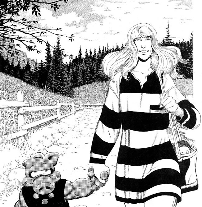 Cerebus är och förblir ett Jordsvin, ”Earth Pig born” och är på alla sätt just ETT SVIN… Därmed ska han också hållas fri från sin skapare, och alla illusioner… För övrigt är han EN SERIE-FIGUR och har därmed inget med VERKLIGHETEN att göra..