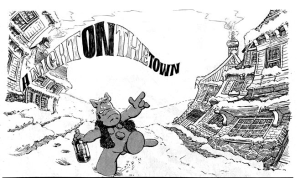 I skildringen av Fylla och Spritmissbruk – går Dave Sim långt… Självupplevt…?? Cerebus raglande, påverkar till synes hela staden runt honom