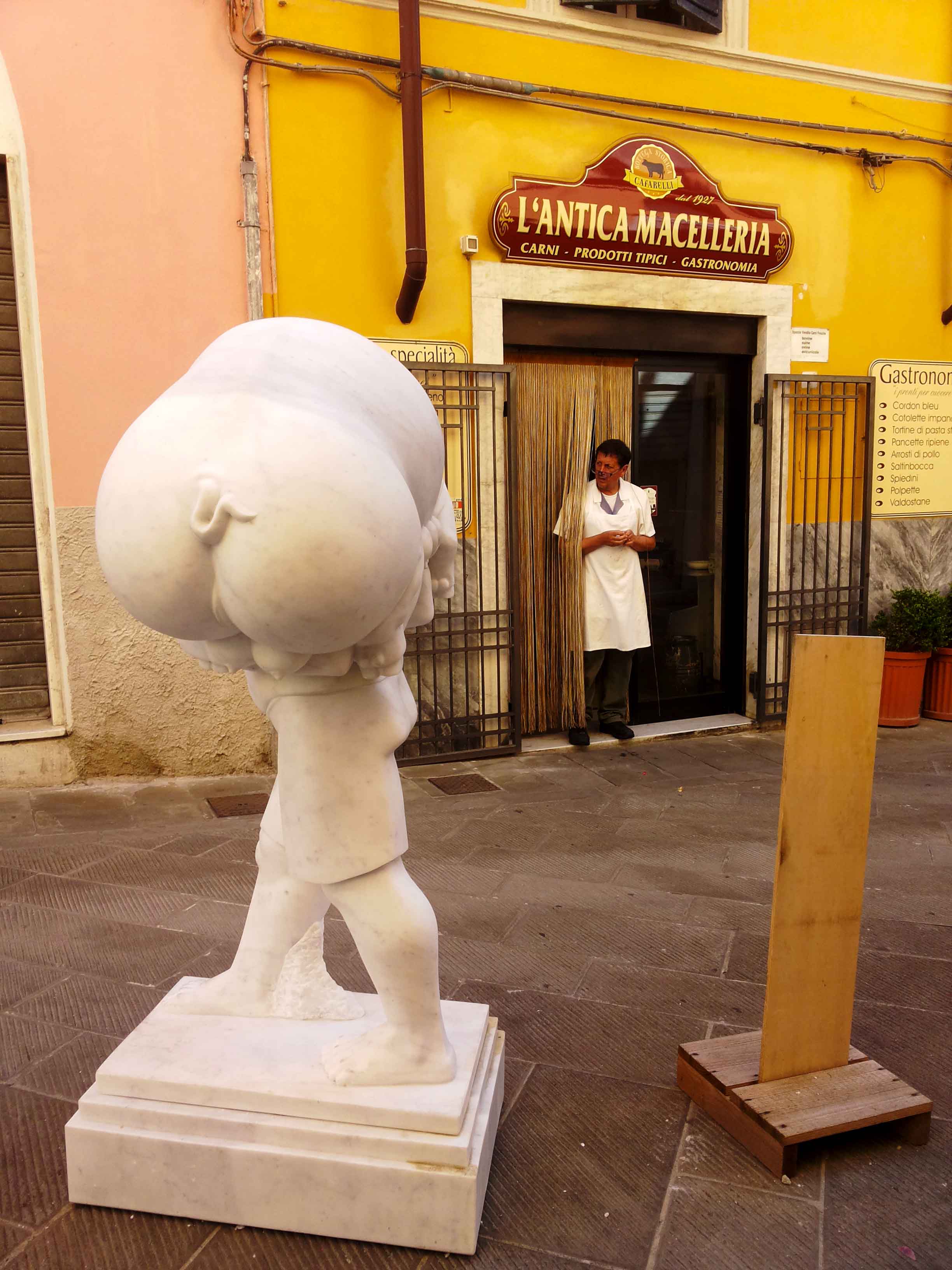 Stenindustrin i staden är mycket anonym, och trots att det pågick en ”marmorfestival” i staden såg jag inte annat än de ständiga bänkskivetillverkarna, men däremot inga konstnärer i arbete. Vill man se sådant, eller besöka stenbrotten (det finns massor av firmor som kör rundturer med jeep och 4-hjulingar för mer än 60 Euro per person) får man ge sig upp i bergen sådär 6-7 km från staden – så är det med den saken. Någon souvenir-industri som säljer marmor i små kvaniteter finns inte heller, annat än några mer eller mindre tillfälliga stånd och barracker längs bergsvägarna upp emot Fantiscritti, Bedizzano, Miseglia och till slut den bästa stenhuggarbyn av dem allihop – Colonnata – som är mer än en mil avlägsen och bara kan nås genom en smal och slingrande serpentinväg, som för upp emot berg med en höjd av 1000 meter över havsytan, eller mer.
