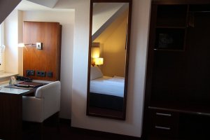 Så vacklade jag mot badrummet, där det ju fanns handfat och vatten, men på vägen dit genom ett nedsläckt hotellrum råkade jag stöta till en full-längds spegel, som hängde bredvid badrumsdörren, så att den föll i golvet, och lämnade ifrån sig några skärvor utan att bli helt knäckt.