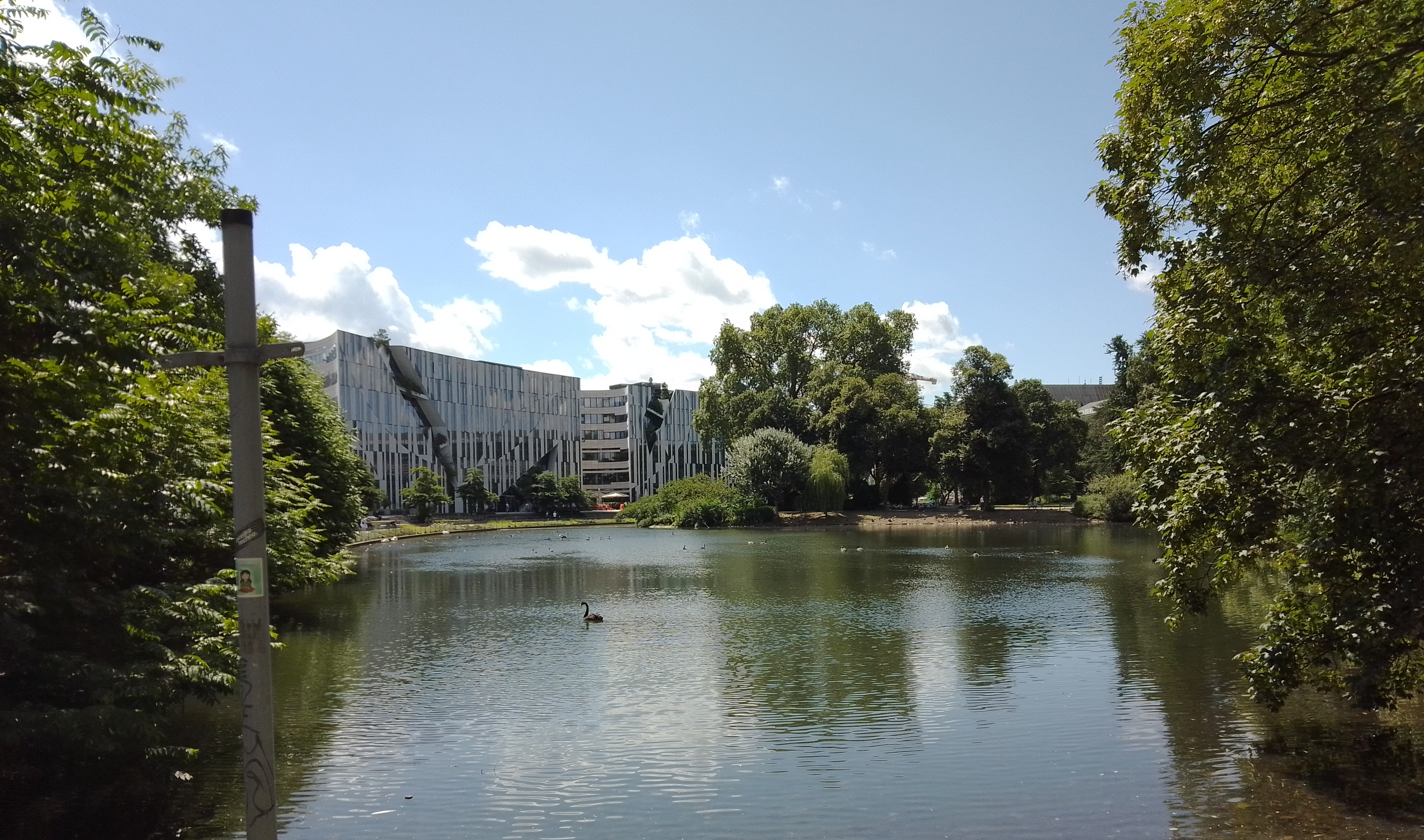 Parkerna på stadens nordsida; ut emot flygplatsen, Arno Brekers gamla villa, det enorma monumentet med de tre Nornorna och diverse arkitekturutställningar från 1930-talets första år, före nazismen – och vad de kom att betyda för Socialdemokratins samhällsbygge här hemma i Sverige (innan det råkade totalt på dekis under 2000-talet) har jag redan beskrivit annorstädes på denna blogg, så det är ingen idé att jag upprepar mig. Hofgarten, och hela det långa parkstråket fram emot Ehrenhof /Tonhalle går fortfarande utmärkt att gå ostörd i, och det gäller också Düsseldorfs zoo, förorten Grafenberg och Aaper berg, som inte är något apberg modell Råsunda eller rättare sagt Osunda, utan bättre än sitt rykte. Sjöar, dammar och stadsdelarna Lörick och Oberkassel på andra sidan Rhen – alltså den västra stranden – är fortfarande njutbara, liksom området kring Düsseldorfer Turm, det stora utsiktstornet av 80-tals snitt.
