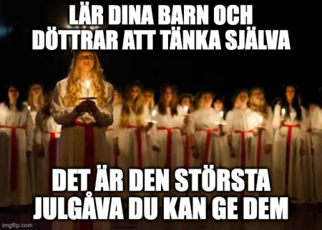 Många etniska svenskar – ja allt fler och fler faktiskt – tycker som jag att den Nordiska Lussi-traditionen är värd att försvara – liksom FRIHETEN – så säger nämligen ett annat känt svenskt ordspråk – ”Friheten är alltid värd att försvara” heter det, och det gäller i stort som i smått. Just därför är det viktigt för oss att aldrig sänka garden, och att fortsätta slåss emot kristendomens och islams horder. Den gamle läraren från Kristianstad, Sven-Yrjö Collin hade den 13:e denna månad följande att säga under rubriken ”Lucia – kristet dravel eller frihetens röst” – och eftersom han är en skribent jag gillar – han har varit omnämnd förr på denna blogg – kan jag inte undgå att citera honom: