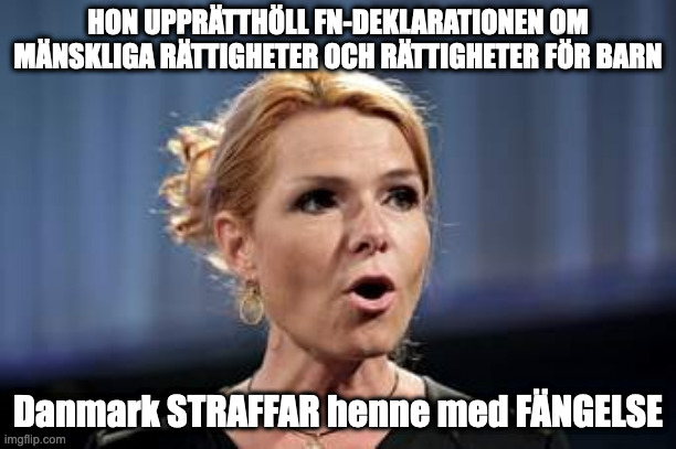 I Danmark har nu den före detta Migrationsministern Inger Stöjberg dömts till 60 dagars fängelse, utan all nåd och utan minsta möjlighet till överklagande. Orsaken är att hon upprätthöll FN:s Konvention om de mänskliga rättigheterna, som säger att ingen person för bli föremål för tvångsäktenskap. Också Barnkonventionen, som FN stiftat, slår fast att inga barn och inga flickor under 18 år får bli bortgifta – men plötsligt skulle alltså detta inte gälla i Danmark..