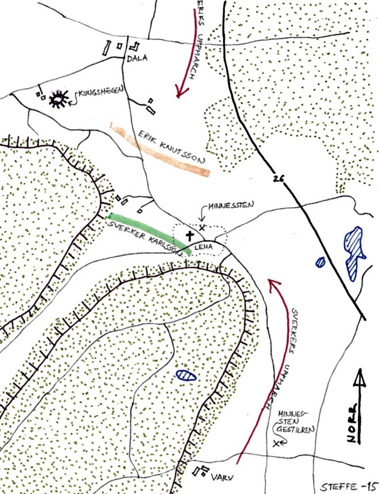 Sverkers här hade sin uppmarsch söderifrån, som kartan visar, och de tände eld på träkyrkan vid Kungslena och gick i ställning på höjderna sönder om byn, mellan Plantaberget i Väster och Varvsberget i Söder. Rakt bakom dem stod förresten en fästning, Lenaborg, på Varvsbergets sluttningar.