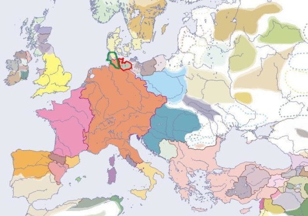 Karta över Knut Lavrads dubbelkungadöme – Slesvig markerat i Grönt, Obotriternas land markerat med Rött – omkring 1115 – 1132 var Knut Lavrad kung över båda områdena.