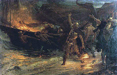 Hämnaren Vale, Segersvärdet och Balders likfärd på det brinnande bålet… (Enligt ett frimärke från Färeöarna och Anker Eli Pedersen)