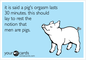 Visste du förresten att enligt Guinness Rekordbok, så skall en vanlig galt i genomsnitt ha en orgasm eller en sädesavgång, som räcker i hela trettio minuter, medan suggans kanske varar i 10-15 eller enligt vissa andra källor sex minuterdet är ojämförligt mycket mer än hos människorna – och därför är det inte svårt att räkna ut, varför Suggor, Galtar och Freja hör ihop, som ler och långhalm…. Vissa forskare har betvivlat detta, men det är helt säkerställt att vildsvin och grisar som får leva fritt är mycket renliga djur och dessutom lyckliga (kanske pga de långa orgasmerna ?) – det är bara brist på utrymme och vätska som får dem att uppsöka lerpölar eller annat, och det påverkar inte födans kvalitet det minsta…