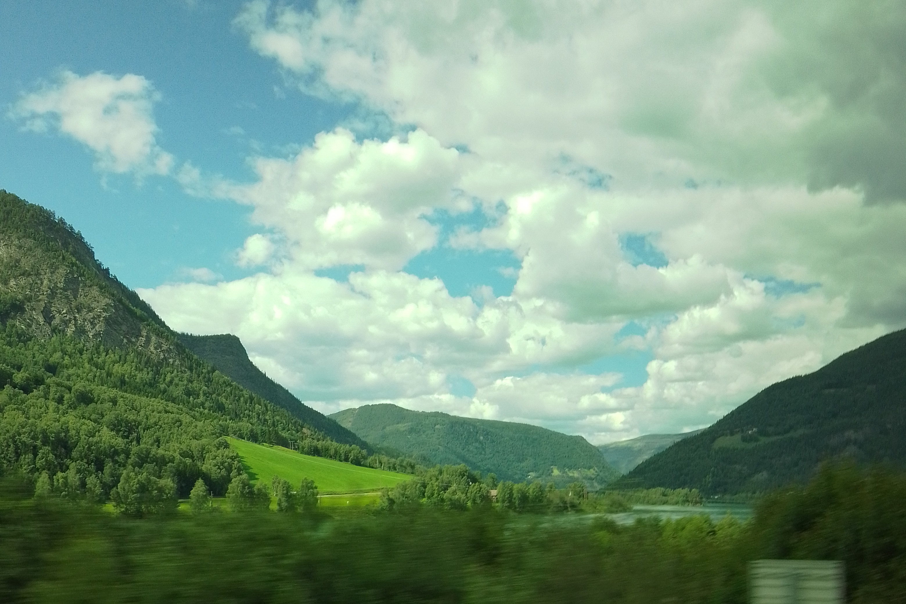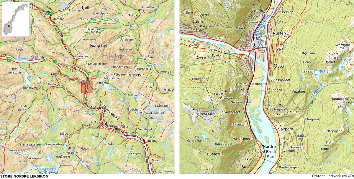 Här syns tydligt skillnaden mellan bergsilhuett, två större höjder och dalbottnen på östra sidan av älven Otta.