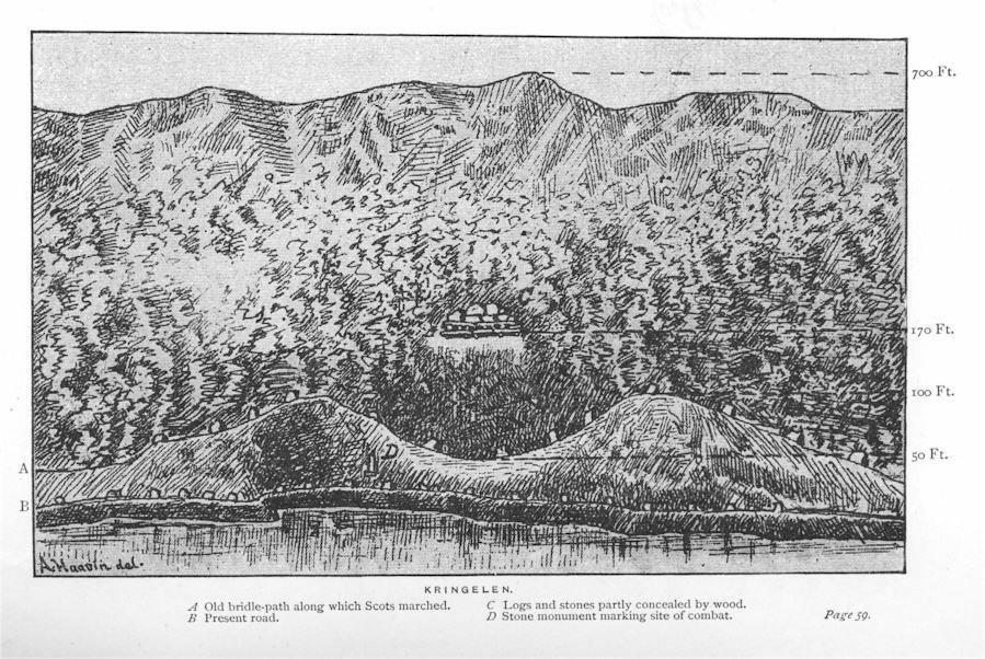 ”Slaget ved Kringen” och slutet för cirka 1000 man, däribland något hundratal skotska klankrigare – Tavla av Georg Nielsen Srömdal, Norskt 1800-tal
