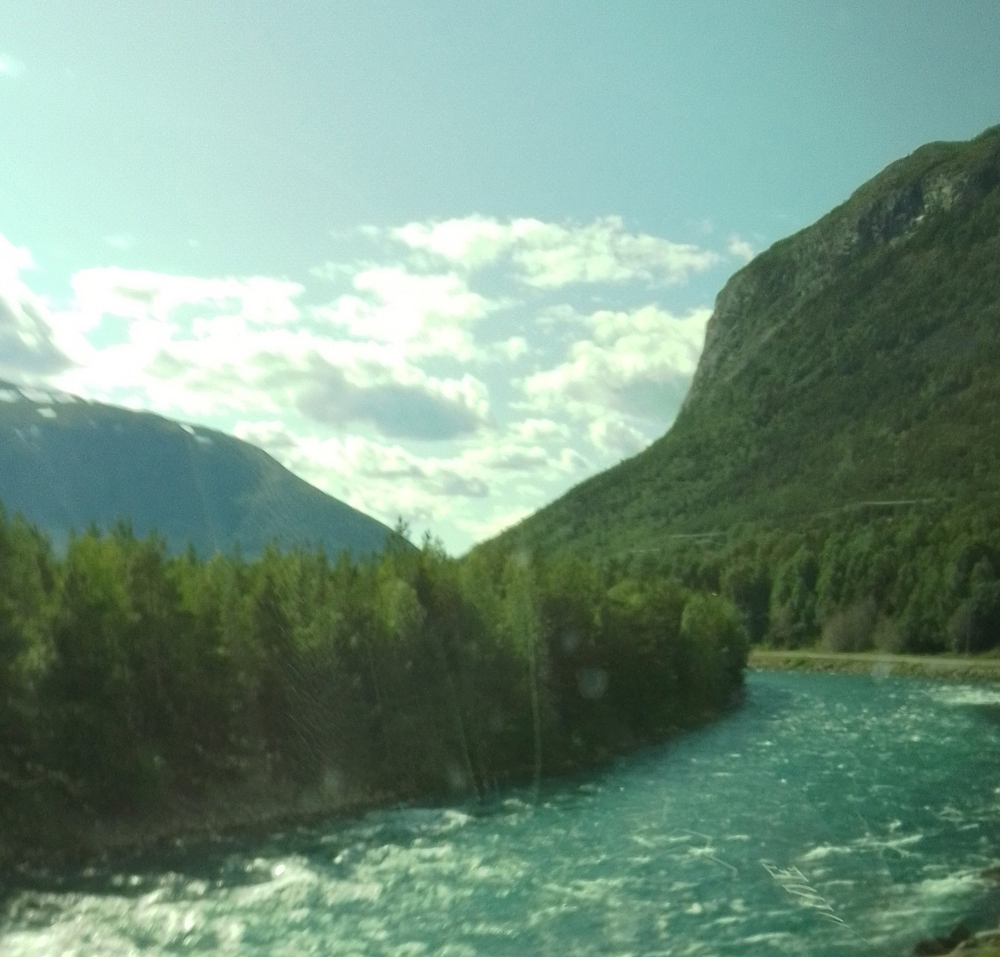 Två andra vägtunnlar av liknande längd, 2-filiga och smala passeras i hög fart – 90 km/h eller så – rakt emot en massa långtradar-trafik och annat från motsatt håll, och så kommer vår Vy.no buss lyckligen ut ned för serpentin-vägen ned emot Strynvattnet, för att därefter köra mot Stryn. Sommartid går det bra at ta sig fram här – men man ska inte vara så lättlurad eller dum, att man som svenskar längs E4 eller E6 tar detta med modern infrastruktur för givet. Så är det inte i Norge. Så är det inte i resten av Nordens länder. Det är bara de själv-idiotiserade svenskarna, infantiliserade av ”Såsial-demokratins” många år, som kan vara inskränkta nog att tro något sådant. Samt alla de som blivit lurade av en viss Mr Trump, västeröver. Vi har lyckligtvis inga högljudda, skrikiga amerikaner med oss ombord – för ”It all seems so Trumped up !”