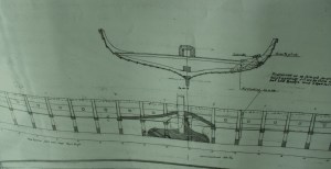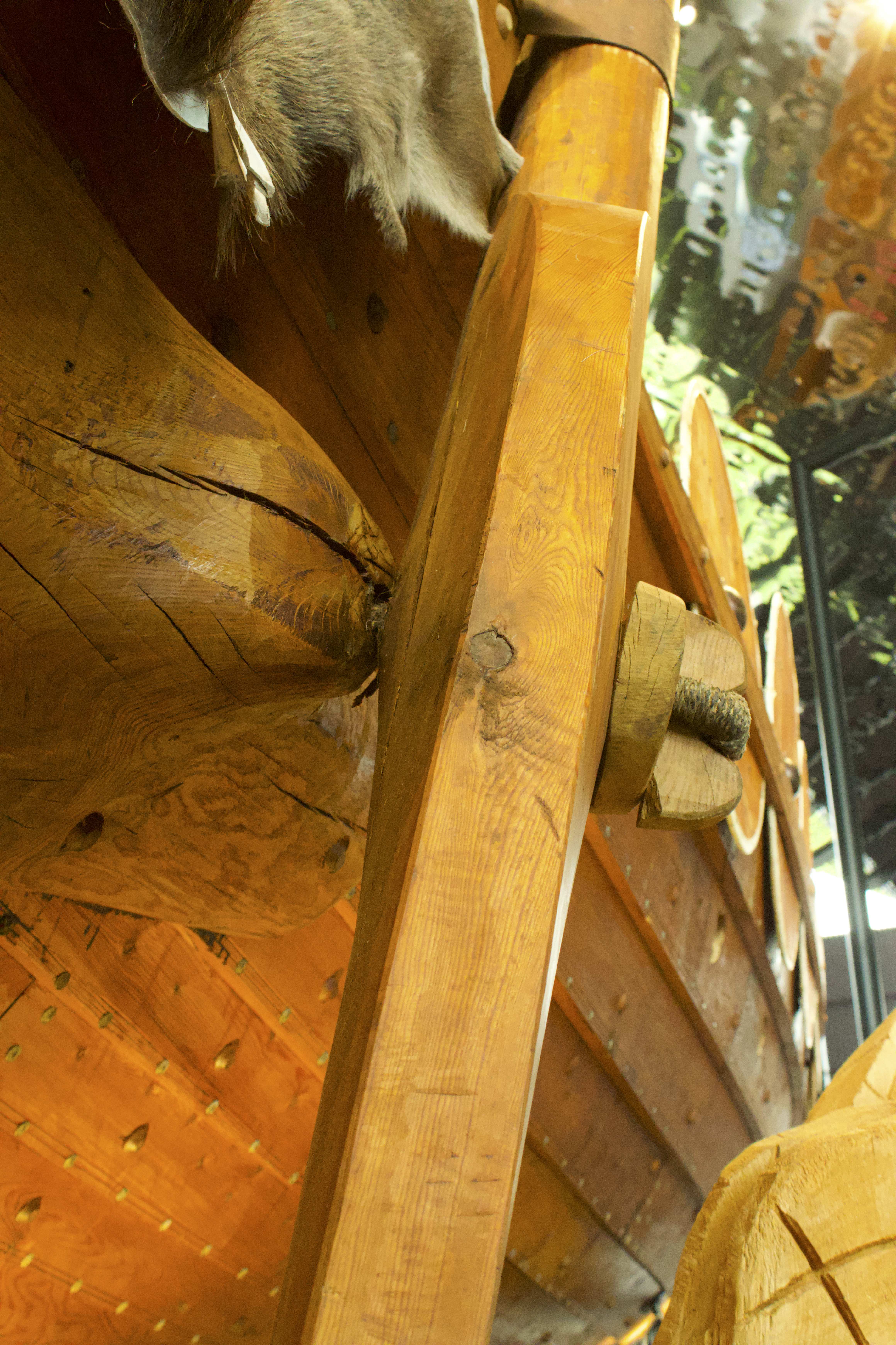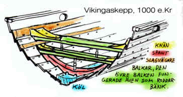 ”Underlutets” form k-a-n vara avgörande, har det visat sig – för med fel vinkel – om så bara 3 cm på 23-30 meter – blir det helt andra seglings-egenskaper under gång. Har man för svaga ”Meginbord” eller de förstärkta och tjockare bordplankor som skall sitta kring vattenlinjen (det är de plankorna ni ser med extra trä-dymlingar på bilden ovan) så kan hela skeppet spricka upp, och det var just det som hände vid ”Dronningens” olyckliga förlisning i en norsk fjord, har det sagts mig. Kunniga män och kvinnor vet vad de gör och hur de timrar – mindre kunniga gör något helt annat. Närmast Kölplankan sitter alltid ”Sambordet” eller det första bord, som börjar ”tura” utåt och som ger skrovet början till dess form, men det visste ni väl redan, eller hur ?