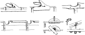Betydligt enklare arrangemang för åror, är att använda Håar av de olika slag som visas ovan – exemplen är tagna från sentida Allmoge-båtar från hela Norden. En ”Hå” eller den hajfen-formade träbit som till formen liknar en ”Håkärring”, en liten haj-art som förekommer i Nordatlanten och vid den svenska Vätkusten på stora djup. Den heter annars ”Somniosus Microcephalus” på latin eller ”den drömska mikro-cefalen” (vi hoppas att ni inte behöver dela kojer ombord med några sådana…) men på Engelska heter den ”Greenland Shark” eller Grönlands-Haj. Bara så att ni vet – eller ”hajar”… Ni ”hajar väl yx-klyk??” En dubbel hå – med klykor åt båda håll – är mycket bra och lätt att ro med – den enkla, hajfen-formade klykan, försedd med en repstump – för ”hamlande” eller när man ska ”stryka” – alltså ro baklänges – är en förenklad variant – det enda mindre praktiska är förstås att en ovan besättning kanske trampar sönder håarna, om den står på relingen, till exempel för att hålla skeppet upprätt vid stark lutning på en kryss-bog.