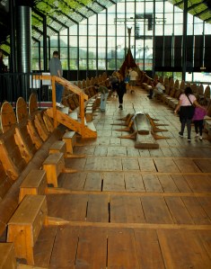 Kistorna för utrustning, modell ”Oseberg” är INTE autentiska, och opraktiskt gjorda. De förvarades INTE vid relingen på detta vis, eftersom de skulle halkat runt på däck under ”normal” segling. Istället hade man kistorna placerade PÅ spanten, och försedde dem med URTAG på varje kortsida. Då kunde kistlocken användas som tofter, dvs för roddarna att sitta på under rodd. När man seglade, var kistorna NEDSTUVADE i varje ”rum” mellan spanten… (bild Copyright hedniska tankar 2025)