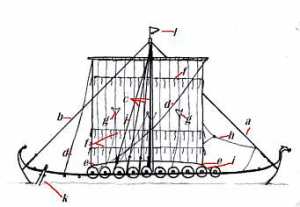 a=förstag, b=akterstag, c=vant, d=brassar, e=skot, f=rev, g=snabbrev, h=bolin i=hals, j=fall, k=roder, l=vindflöjel (kunde även vara placerad i förstäven).