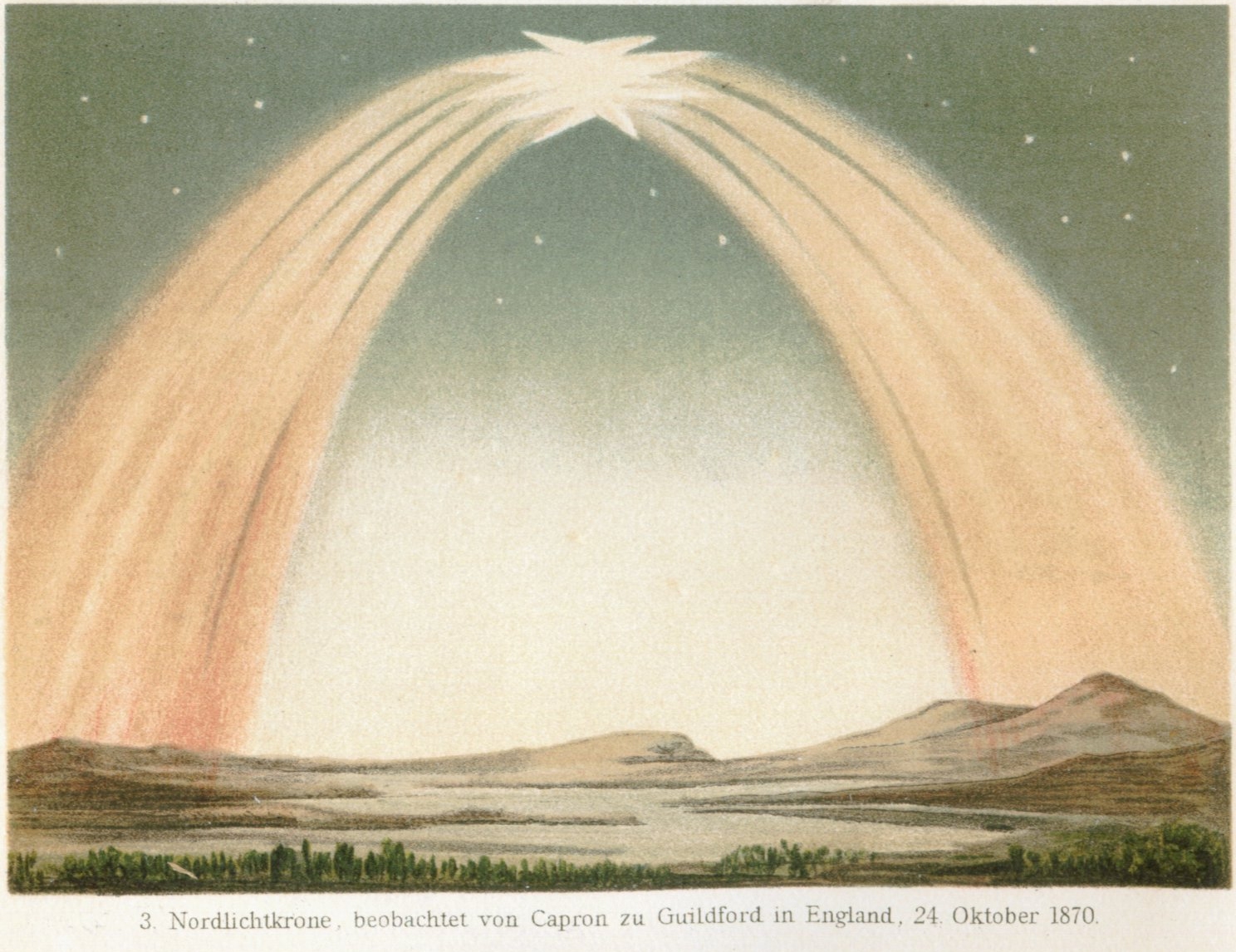 Bild från Wikipedia – 1870 sågs norrskenet klart och tydligt i Guildford, Surrey, England – en händelse som ytterst sällan inträffar