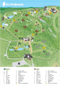 I ett mycket litet hägn alldeles norr om WC-bygnaderna och det gula ”I” (för information) som syns mitt på kartan ovan, fanns en mycket liten damm, som ni ser. Där fanns en större björnhanne som ”låg på rov” med en älgskonk – brunbjörnar kan både fälla älgar eller äta självdött vilt vid myrmarker, sjöar och liknande, släpa iväg med köttet långa sträckor – någon kilometer om så krävs – och sedan bara ligga stilla och äta, sova och bevaka maten så länge festen varar. Kommer då någon kråkfågel, vargar eller någon annan varelse i närheten, attackerar björnen efter bästa förmåga, och driver bort dem. Detta är ett helt naturligt beteende för alla björnar, och isbjörnen gör likadant, då det gäller säl, valross eller vad som helst… Men dumt nog hade man placerat en mycket liten och svag björnhona – troligen en fjolårsunge – intill den större hannen, och hon vågade av naturliga orsaker inte gå nära honom, utan var hänvisad till en 30 -40 cm smal gång, på den lilla dammens norra sida, som vette upp emot det berg, som dominerade hela den norra delen av parken. Björnhonan tryckte sig mot stängslet – vanligt Gunnebo-stängsel av svenskt fabrikat – och hade vandrat fram och tillbaka, fram och tillbaka på sin sida av dammen, tills att marken slitits upp. Konstigt då att vissa björnar till slut gräver sig ut, letar efter rötter – Skansens brunbjörnar gör likadant – eller allt som går att äta eller framstår som ”intressant” för en hungrig björn ??  Människor i fångenskap är ännu bättre på att planera sina flyktförsök – av sociala och mentala skäl, då Homo Sapiens var. Sapiens är en intelligentare djurart än just Ursus Arctos, eller en vanlig brunbjörn.