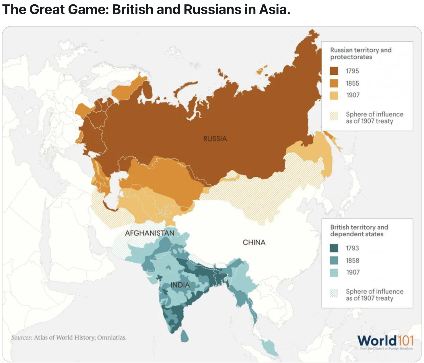 Men låt oss inte gå händelserna i förväg. Engelsmännen – eller det Brittiska Samväldet hade redan långt före Napoleon etablerat sig i Indien, och redan på 1830-talet började det första Anglo-Afghanska kriget i det som senare skulle kallas The Great Game” eller Storbritannens försök att behålla kontrollen över Centralasien, och som skulle avslutas först i och med Indiens och Pakistans självständighet 1947dessa två stater är ju  fortfarande kärnvapenmakter… och det är stor tur för västerlandetannars finns det inget som kan neutralisera Rysslands och Kinas obegränsade nukleära kapacitet, för dessa länder har aldrig hållit sig till några internationella avtal..