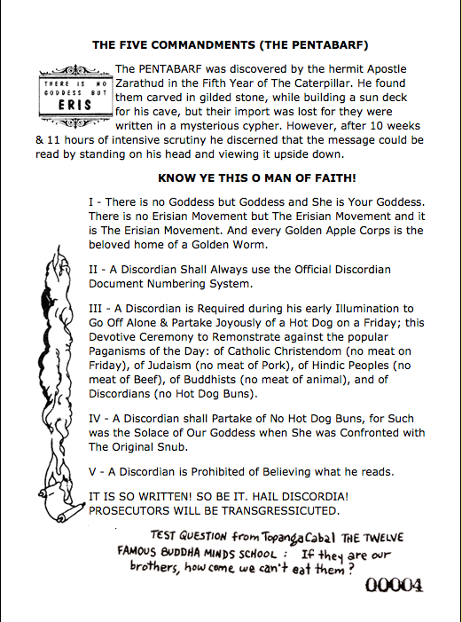 Och inte nog med det. De uppfann också den heliga Pentabarfen – ett slags parodi på de fyra Moseböckerna – vilken i original lyder som följer: