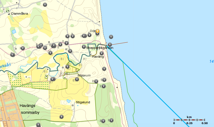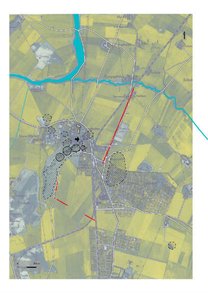 Röda markeringar både innanför och utanför stadsvallen visar läge för bryggor och båthus