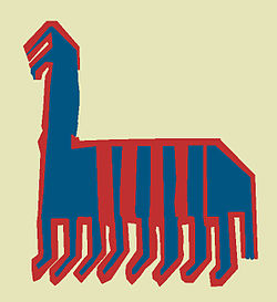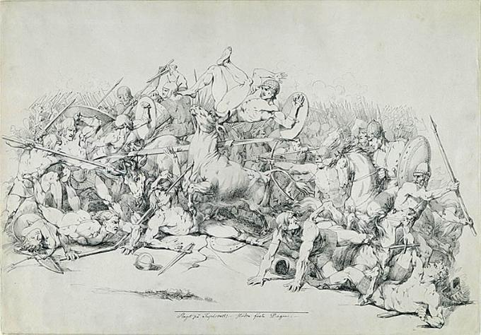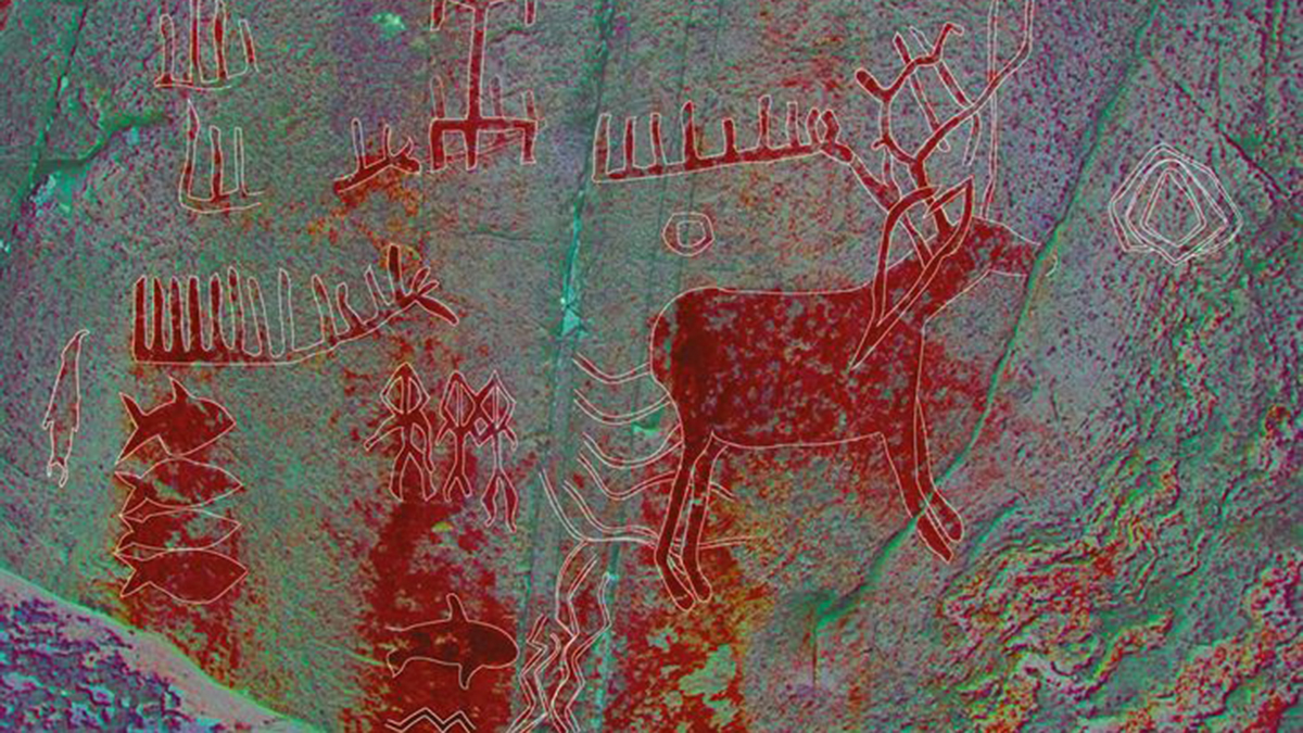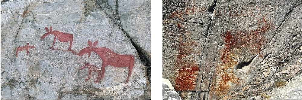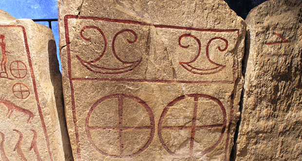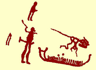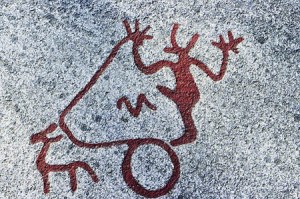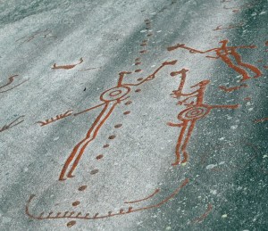 Denna hällristning från Bohuslän innehåller yxlyftare på båda sidor om en tydligt markerad gräns…