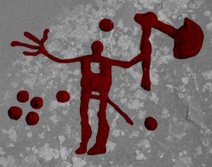 Betyder skålgroparna till vänster om denne yxlyftare från Flyhov vid Kinnekulle siffran ”fem” ? Och är skålgroparna ovanför och till höger om figuren en markering av solen eller månen i zenith, respektive vid horisonten – som en del föreslagit ??