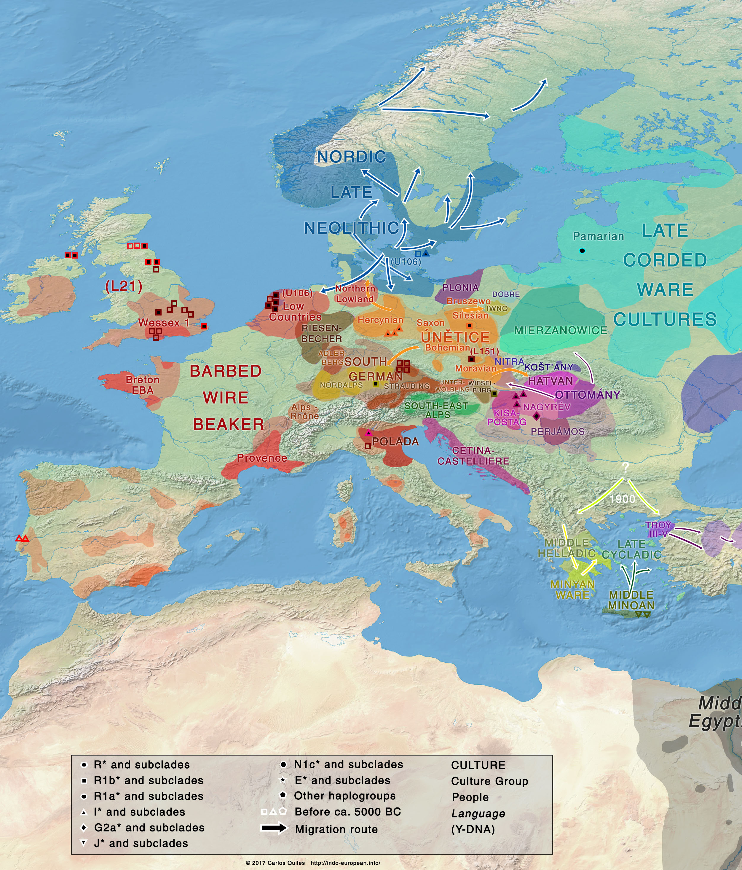 När Stonehenge byggdes på och byggdes ut, från 3100 – 2500 fk var Cheddar-mannen och alla som såg ut som honom döda sedan mer än 3500 år. En helt ny ras hade intagit hela Britannien… Dagens Britter – och det har genetiker och forskare fastslagit med stort eftertryck – härstammar till 90 % inte alls från några ”Cheddar-män” oavsett om dessa nu skulle ha varit negrer eller ej. Bara 300-500 år efter det att Stonehenge påbörjats, kom en helt ny människoras till ön. Det var klockbägarkulturen från Rhenlandet, som ursprungligen bestod av 100 % långskalliga och ljushåriga Indoeuropéer, men som blivit starkt utblandad på vägen, och därför slutade som Brakycefaler, eller alltså ”korta om huvudet” när de blandat upp sig med vad redan Spence kallade ”den alpina rasen” i sydtyskland. Detta språkbruk har forskarna längesedan gått ifrån, men forskare från Göteborg, Bradford och andra lärosäten i England är helt eniga om en sak – de invandrare, som för 2500 – 2000 år sedan kom till de brittiska öarna, utplånade nästan alla andra kulturer och folkslag som redan fanns där – och det gick fort – ett par tre generationer högst.