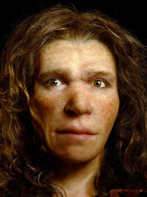 ”Klassisk” Neanderthalare, i 60-års åldern… Var Europé, för 60 000 år sedan – inte alls Afrikan… På senare tid har det blivit ytterst populärt att skildra alla ”äldre” människofynd som negrer, och göra dem svarta i hyn. Se mitt tidigare inlägg om ”Cheddar-mannens totala förnegring” under förmänniskor här ovan. Genetikerna är överens om, att det bara krävs 3000 års vistelse i kallt klimat (som i Istidens Europa eller Central-asien) för att bli av med all skarp pigmentering – och i de här sammanhangen, är 3000 år väldigt väldigt lite.. Man behöver bara svart pigment om man vistas i tropiskt klimat, nämligen, och gör man inte det, så försvinner det så småningom. Svante Pääbo och andra har också visat, att Blont hår och blå ögon är ett typiskt ”Neanderthal-drag” liksom rött hår – som i sig kräver blonda föräldrar i tre led bakåt, på både mödernet och fädernet, och därför är sällsynt, även idag