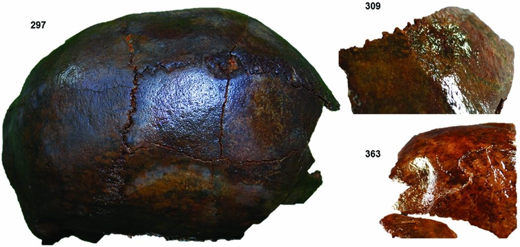 Ovanpå stenpackningen i Motala Ström hittade man fynd av människokranier (blått) på pålar, björnskallar (röda) och Vildsvinshuvuden (gula) Arkeologen Hallgren jämför med dagens katoliker, som också har sönderbrutna skallar i sina kyrkor, som de vördar som ”heliga reliker” och finner att stenålderns religiösa liv var mycket mer komplicerat än vi trott. Björnkäkarna bär spår efter knivar, likt järnålderns björnskallar under Frösö kyrka – som inte alls kom dit pga samer – men sådana spår finns inte alls på människokranierna. Personerna ifråga har inte alls blivit uppätna, men sannolikt stupat i strid, och trots en mängd obevisade spekulationer om stenålderns sociala liv, tror forskare nu att den enstaka Gotländskan slunkit med av misstag, ”befunnit sig i en högrisk-grupp för våld” (var hon för stor i käften, eller svår att ha och göra med ??) men hamnat i Östgötarnas dödstempel… Det visade sig tydligt, att Människokranierna förvarats framför en fond av björnhuvuden, som kanske suttit på stolpar de med, samt att vildsvin ätits på platsen, något längre österut, med galtar och galtars huvuden som ett typiskt fynd. ”Grymta månde grisarna, om de visste hur den gamle galten lider” !