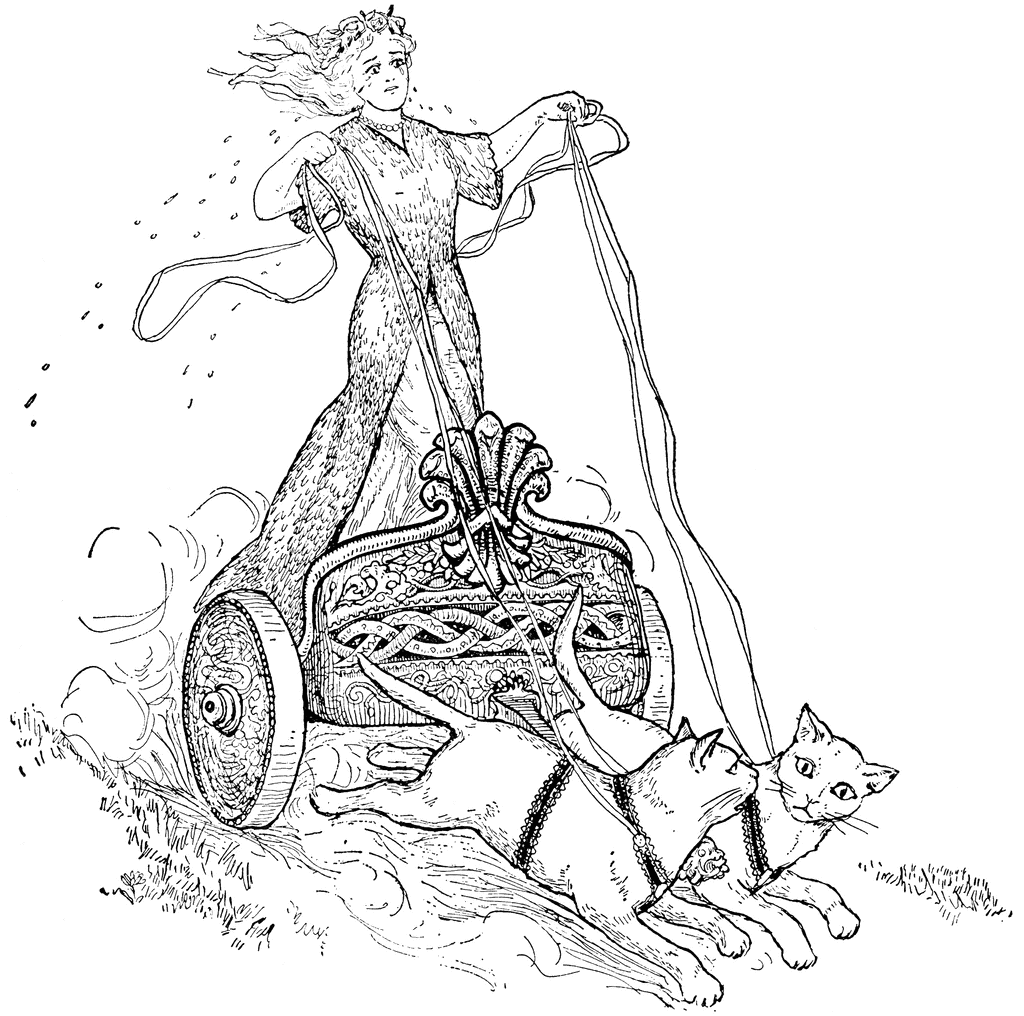 Freja är ju en gudinna, och kan därför göra vad hon vill – det är en klarsynt observation – och som kärlekens gudinna kanske hon till och med kan få katter att enas, och dra en vagn tillsammans. Alla kattägare vet förstås, att det i verkligheten är fullständigt omöjligt att få katter att dra vagnar eller göra något ordentligt arbete.