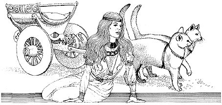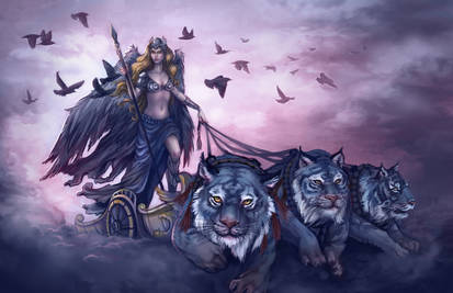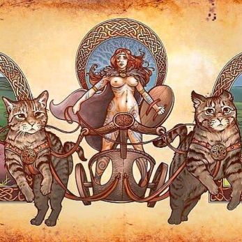 Som jag många gånger påpekat, tänks Frejas katter i konsten oftast vara två – men i Eddan står inget skrivet om deras antal överhuvudtaget, och moderna fantasy-författares påståenden om att de skulle heta Bigull och Traegull, samt att detta skulle betyda Honung och Bärnsten kan ni glömma med en gång – sådant är bara förfalskningar, och kommer inte göra er populära i gudinnans ögon… ”Aft kötta sinum” står det, i den enda passage där Frejas katter alls nämns, och kötta är plural, vilket lika gärna kan vara en hel skock, som två, tre eller vilket antal som helst..