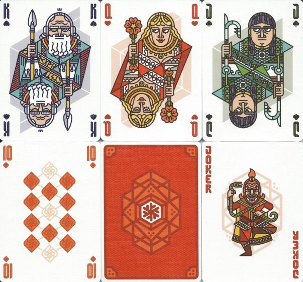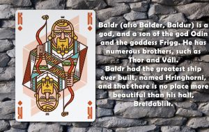 Här ser vi korten för Oden, Freja och Njord – skeppsbyggnadskonstens gud, som ganska vitsigt avbildas med en båtshake i handen, samt ett prov på ”lankorna” i leken, och Loke som Joker.. Det enda jag såsom varande hedning inte kan förstå är att man avbildar Balder med en pilbåge i handen – vilket går emot alla bildframställningar av honom som någonsin gjorts – Ull är vanligen en bågskjutande gud, men Balder bär aldrig några vapen – och även om han blev skjuten av sin bror Höder med misteltenen, är denna tolkning mer än lovligt fri…