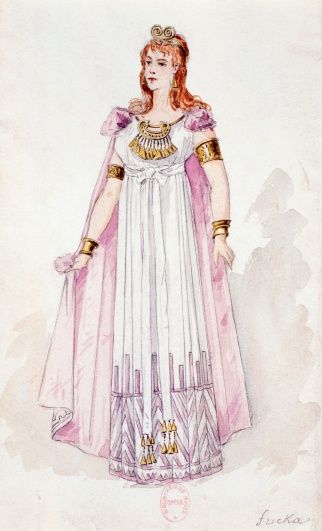 ”Fricka” i Wagners tyska opera-värld – dräktskiss från det tidiga 1900-talet – observera hur konstnären missuppfattat bronsålderns dräktspännen i spiral som en hårprydnad…