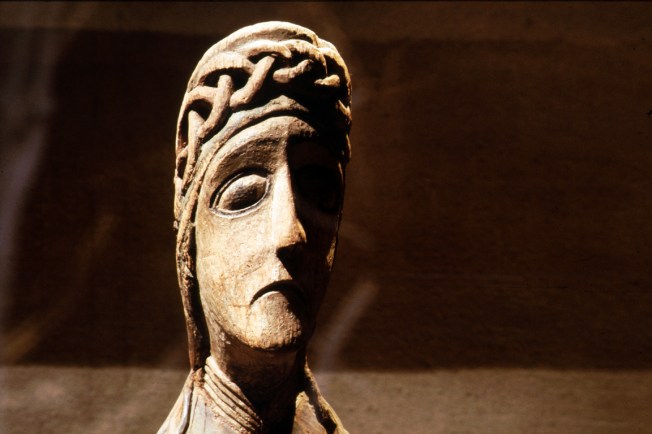 Men Viklau-madonnan, då ? Hur står det till med hennes huvud, egentligen ? I veckan gjorde en av historiska muséets konservatorer en häpnadsväckande upptäckt – hela madonnans huvud är fullt med Hedniska Tankar – för i henne finns ett bronsåldersfynd, och detta var hennes skalle proppfullt med, under alla dessa år sedan det sena 1100-talet, då hon gjordes..