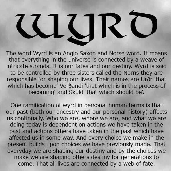Jag har redan nämnt begreppet ”Wyrd” eller ödet för er, liksom detta med vad antikens folk kallade ”Nemesis Divina” eller ska vi säga Nornors och Fylgiors förbannelse. Dag Strömbäck, den svenske folkloristen, skrev en gång en uppsats om Sagan om Gunnar Tidrandebane och Diserna, eftersom det i just den sagan förekommer ett långt stycke om hur tolv goda diser ses kämpa med tolv onda. Vi skulle också kunna ta exemplet med Norna-Gest, som spås en hemsk framtid av Nornorna (varför tror ni han råkar ut för det, och varför åläggs detta öde också hans mor, om inte annat än för föregående generationers förbrytelser) eller Starkad den Gamle, som råkar ut för det ödet, att han skall leva i tre mansåldrar, men för varje mansålder måste begå ett gruvligt nidingsdåd, vilket också förutspås av gudarna själva. Jämför också med hur Norna-gest lever i 300 år, alltså just ”tre mansåldrar” eller i vart fall sekel.