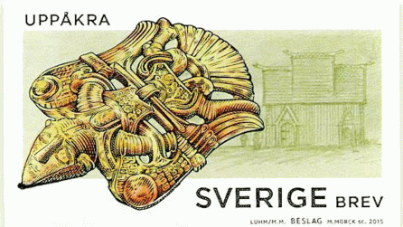 Samma spänne på frimärke från 2015, med Uppåkras Gudahov i bakgrunden