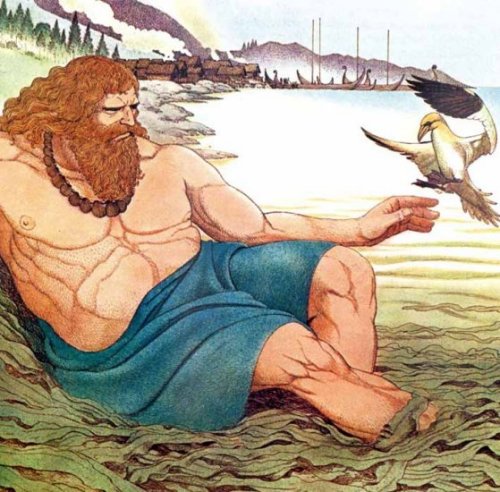 Njord (här illustrerad av Giovanni Casselli på 1990-talet) är gud även över skeppsbyggnad, och havets alla djur