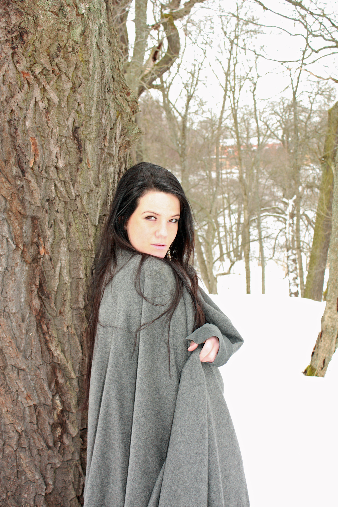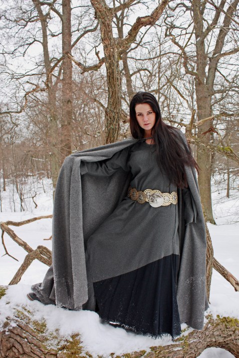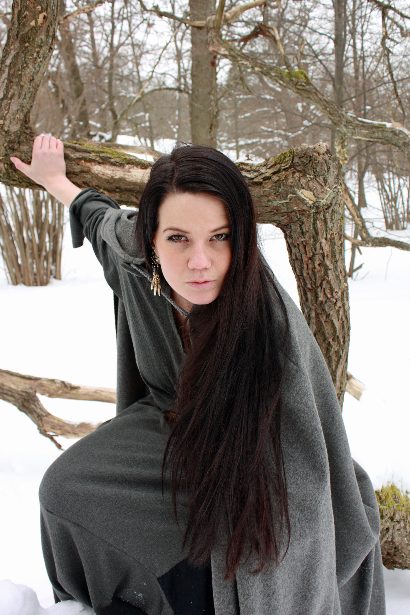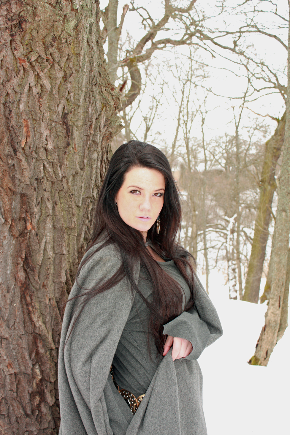 Skade som jag själv skildrade henne, vintern 2012 – på ett gammalt gravfält nära Stockholm (svarthårig och med grekiska smycken)