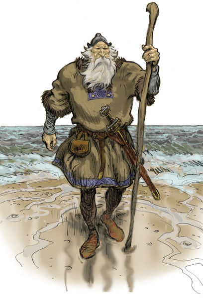 In one story, Starkad did ”Sitting outside” or ”utesittning” in deepest snow, all naked; and through his Berserker rage, he became so hot that he melted the snow around him, and thus sat in a pit, sink into the snow, when his adversaries came to meet him. Similar stories, oddly enough, have been told about Shinmen Miamoto Musashi and others like him in Japan, and the ability to melt snow, or withstand strong cold, ”stilling blood” or stopping blood-flow with just sheer willpower, to some, at least, might actually be genuine.. Starkad is usually depicted as an old man, with staff or runic wands ”kavel” in his hand, and many locations the Nordic countries over, particularly in Northland, have folk-memories after him, or even hold his supposed grave..