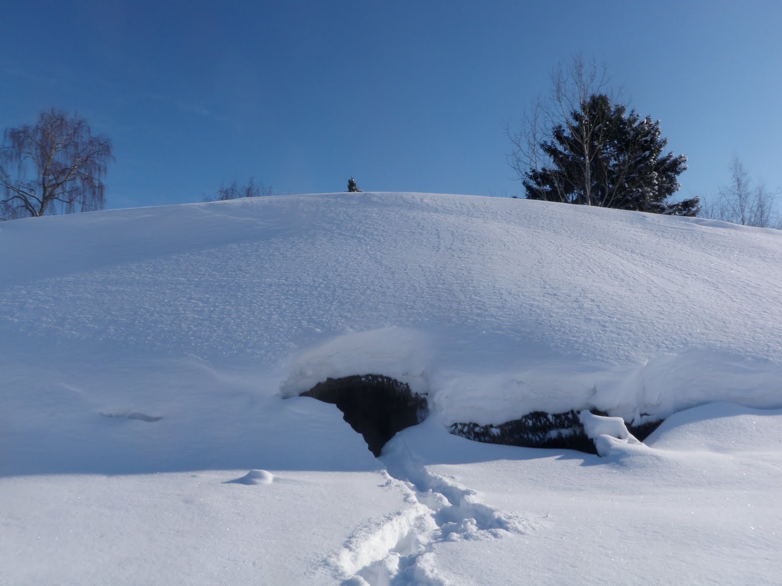 Shelter might cosist of a large fir tree, with its long broom-like branches hanging down almost to the ground – and as they quickly get covered with snow, underneath, you might find much less snow or even bare ground. Now, take one log of wood, and place it upright against the tree-trunk in vertical position – add another as a cross-beam on top (like a Thor’s Hammer – easy to remember, isn’t it ?) and you have a chair to sit on. Now, lean your back against the trunk of the fir, sitting atop the small stool made from two loose logs, and fold in your legs beneath you. You might even sleep in this crouching position, all night long, and no matter how hard it rains, snows or how heavy the winds are, you still have protection from the fir tree.. ”Skog är fattigmans rock!” or ”The forest is the coat of a poor man!” as the Swedish saying goes. Failing that, you might do like this – jumble together as large a pile of snow as you can manage, provided there is no snowdrifts about..