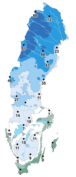 Först nu är det Vinter i hela vårt land, om man får tro SMHI:s mätningar. Vintern inträffar som vanligt när dygnets medeltemperatur, dag som natt understiger noll grader, och först idag har det uppnåtts vintertemperaturer i hela landet, om man får tro SMHI:s kartor. Hittills har vintern varit onormalt sen, men det kan man inte fästa sig vid alltför mycket. Det är först efter många års utveckling eller i det verkligt långa tidsperspektivet som man kan se, om det förekommer några storskaliga förändringar eller inte.